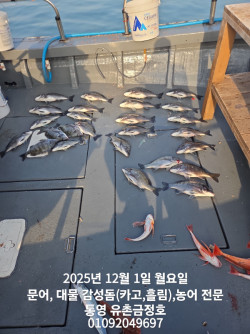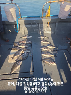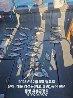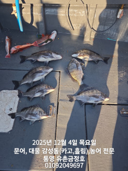 안녕하세요 통영 금정호 대물감성돔 카고 조황입니다오늘은 확실히 마릿수가 돌아오기 시작하네요다만 싸이즈에 아쉬움이ㅠ내일도 열심히 잡아보겠습니다다음주 월요일부터 자리있습니다널널하게 손맛보러가실분 연락주세요~문의번호선장 01092049697♧예약안내♧12월 08일 월요일 카고선상 자리여유12월 09일 화요일 카고선상 자리여유12월 10일 수요일 카고선상 자리여유12월 11일 목요일 흘림 선상 7자리여유12월 12일 금요일 흘림 선상 자리여유12월 13일 토요일 흘림선상 5자리여유12월 14일 일요일 흘림선상 자리여유- 이후 대물감성돔 자리있습니다 -#금정호 #유촌금정호 #낚시 #감성돔 #가을 #통영 #조황 #문어 #선상 #문어선상 #선상낚시 #바다낚시 #추석 #연휴 #오후 #오후출조 #오후문어 #갑오징어 #갑이#이벤트 #무료승선권 #할인권 #금어기 #첫출항.문의번호선장 01092049697이벤트와 예약현황은 아래링크를 참고하세요http://geumjeong.sunsang24.com/'유촌 금정호' 밴드로 초대합니다.https://band.us/n/acac09acQ98fw*** 통영 금정호 예약 안내 ***예약문의 : 010-9204-9697오시는길 : 경남 통영시 도산면 저산유촌길 83홈페이지 : http://geumjeong.sunsang24.com/