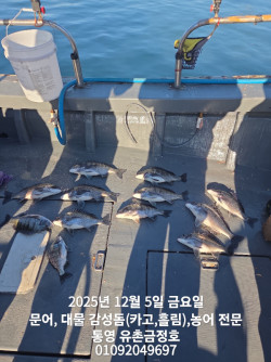 안녕하세요 통영 금정호 대물감성돔 카고 조황입니다오늘도 열심히 잡아내고 왔답니다시작이 5짜라 싸이즈도 좋으려나 했는데꼬마친구들이 섞였네요수요일 카고 자리있습니다널널하게 손맛보러가실분 연락주세요~문의번호선장 01092049697♧예약안내♧12월 09일 화요일 카고선상 완료12월 10일 수요일 카고선상 3자리여유12월 11일 목요일 흘림 선상 7자리여유12월 12일 금요일 흘림 선상 자리여유12월 13일 토요일 흘림선상 자리여유12월 14일 일요일 흘림선상 5자리여유- 이후 대물감성돔 자리있습니다 -#금정호 #유촌금정호 #낚시 #감성돔 #가을 #통영 #조황 #문어 #선상 #문어선상 #선상낚시 #바다낚시 #추석 #연휴 #오후 #오후출조 #오후문어 #갑오징어 #갑이#이벤트 #무료승선권 #할인권 #금어기 #첫출항.문의번호선장 01092049697이벤트와 예약현황은 아래링크를 참고하세요http://geumjeong.sunsang24.com/'유촌 금정호' 밴드로 초대합니다.https://band.us/n/acac09acQ98fw*** 통영 금정호 예약 안내 ***예약문의 : 010-9204-9697오시는길 : 경남 통영시 도산면 저산유촌길 83홈페이지 : http://geumjeong.sunsang24.com/