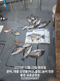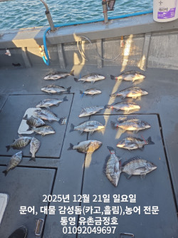 안녕하세요 통영 금정호 대물감성돔 카고 조황입니다오늘도 잘 잡히네요~오늘은 골고루 전원손맛에 전원 마릿수했답니다^^수요일 자리있습니다내일 선단배 여유있습니다^^연락주세요^^문의번호선장 01092049697♧예약안내♧12월 23일 화요일 카고선상 완료(선단배 연결가능)12월 24일 수요일 카고선상 3자리여유12월 25일 목요일 카고선상 완료 (선단배 연결가능)12월 26일 금요일 카고or흘림 선상 자리여유12월 27일 토요일 흘림선상 자리여유12월 28일 일요일 흘림선상 자리여유- 이후 대물감성돔 자리있습니다 -#금정호 #유촌금정호 #낚시 #감성돔 #가을 #통영 #조황 #문어 #선상 #문어선상 #선상낚시 #바다낚시 #추석 #연휴 #오후 #오후출조 #오후문어 #갑오징어 #갑이#이벤트 #무료승선권 #할인권 #금어기 #첫출항.문의번호선장 01092049697이벤트와 예약현황은 아래링크를 참고하세요http://geumjeong.sunsang24.com/'유촌 금정호' 밴드로 초대합니다.https://band.us/n/acac09acQ98fw *** 통영 금정호 예약 안내 ***예약문의 : 010-9204-9697오시는길 : 경남 통영시 도산면 저산유촌길 83홈페이지 : http://geumjeong.sunsang24.com/