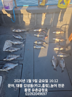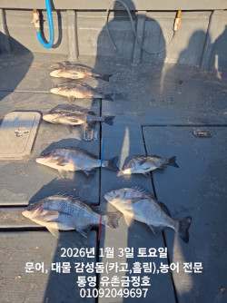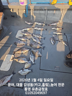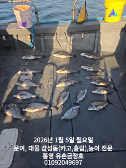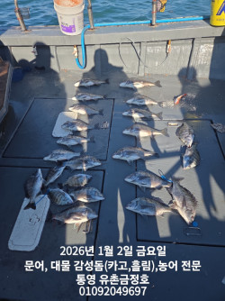 안녕하세요 통영 금정호 대물감성돔 카고 조황입니다오늘 엄청난 강추위에도 열심히 잡아내고왔답니다수온이 내려가믄서 입질이 많이 예민해지네요충분한 기다림 이후 챔질부탁드립니다!예약 완료일은 선단배 연결가능하며월요일부터 자리있습니다! 연락주세요^^문의번호선장 01092049697♧예약안내♧01월 02일 금요일 카고선상 완료 (선단배 연결가능)01월 03일 토요일 카고선상 완료(선단배 연결가능)01월 04일 일요일 카고선상 완료 (선단배 연결가능)01월 05일 월요일 카고선상 4자리여유01월 06일 화요일 카고선상 4자리여유01월 07일 수요일 카고선상 자리여유01월 08일 목요일 카고선상 자리여유01월 09일 금요일 카고선상 5자리여유01월 10일 토요일 카고or흘림 선상 자리여유01월 11일 일요일 흘림선상 2자리여유- 이후 대물감성돔 자리있습니다 -#금정호 #유촌금정호 #낚시 #감성돔 #가을 #통영 #조황 #문어 #선상 #문어선상 #선상낚시 #바다낚시 #추석 #연휴 #오후 #오후출조 #오후문어 #갑오징어 #갑이#이벤트 #무료승선권 #할인권 #금어기 #첫출항.문의번호선장 01092049697이벤트와 예약현황은 아래링크를 참고하세요http://geumjeong.sunsang24.com/'유촌 금정호' 밴드로 초대합니다.https://band.us/n/acac09acQ98fw *** 통영 금정호 예약 안내 ***예약문의 : 010-9204-9697오시는길 : 경남 통영시 도산면 저산유촌길 83홈페이지 : http://geumjeong.sunsang24.com/