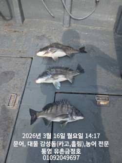 통영 금정호 대물 감성돔 카고 선상 조황입니다복수전 시원하게 하고왔답니다^^점심즈음 받힌 피딩에 밥을 먹은건지 고기를 잡은건지ㅋㅋ재미나게 전원손맛보고 왔습니다내일은 선단배 자리있습니다일요일 2자리 여유있습니다시원하게 손맛보러가실분 연락주세요~문의번호선장 01092049697※ 예약 안내 ※03월 21일 토요일 카고 선상 완료(선단배 연결가능)03월 22일 일요일 카고 선상 2자리여유03월 23일 월요일 카고 선상 2자리여유03월 24일 화요일 카고 선상 자리여유03월 25일 수요일 흘림 선상 자리여유- 이후 쭉~ 자리여유 있습니다 -문의번호선장 01092049697#금정호 #유촌금정호 #낚시 #감성돔 #가을 #통영 #조황 #문어 #선상 #문어선상 #선상낚시 #바다낚시 #추석 #연휴 #오후 #오후출조 #오후문어 #갑오징어 #갑이#이벤트 #무료승선권 #할인권 #금어기 #첫출항.이벤트와 예약현황은 아래링크를 참고하세요http://geumjeong.sunsang24.com/'유촌 금정호'